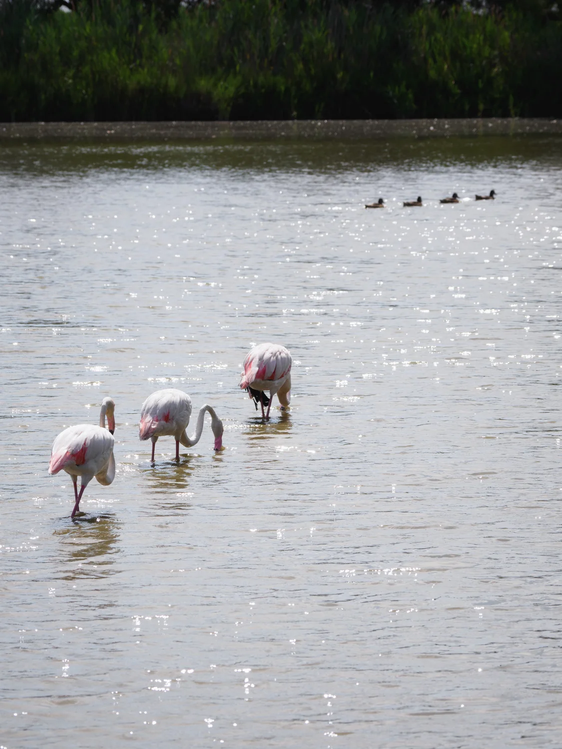 I fenicotteri sono gli animali simbolo della Camargue e al Pont de Gau non deludono. Incuranti della presenza dell’uomo, si avvicinano alle passerelle offrendo occasioni fotografiche continue: becchettano nel fango filtrando i crostacei, litigano per il territorio sbattendo le ali, si dispongono in fila con geometrie quasi coreografiche. Qualche scatto non potevo negarglielo.