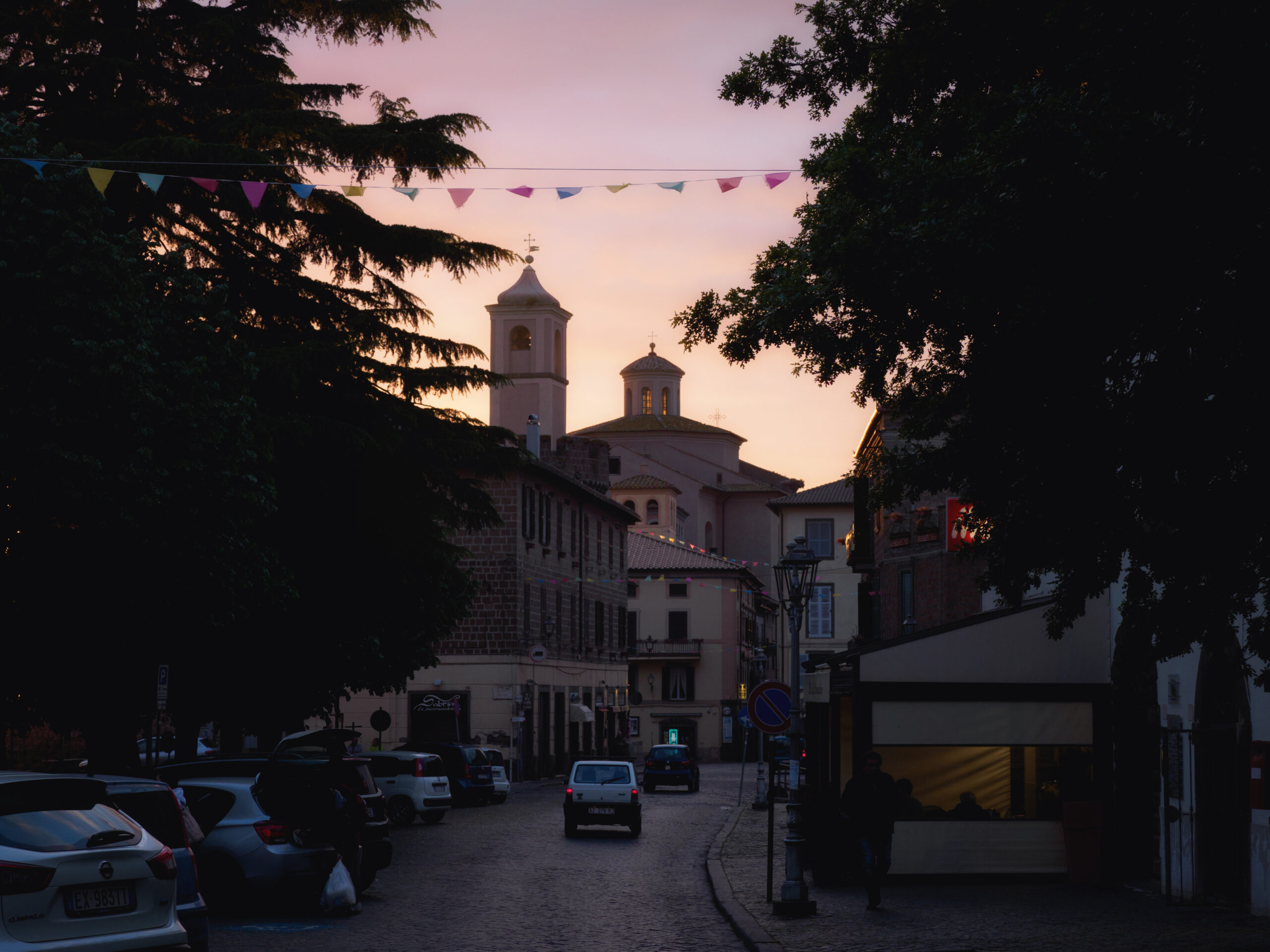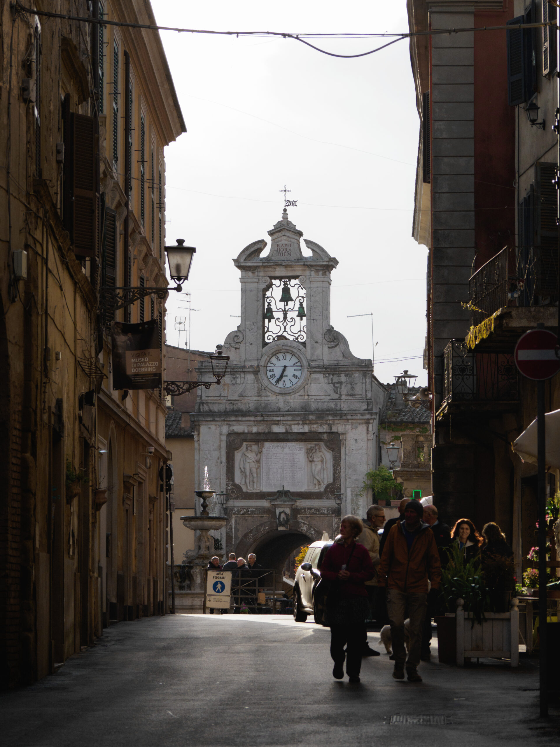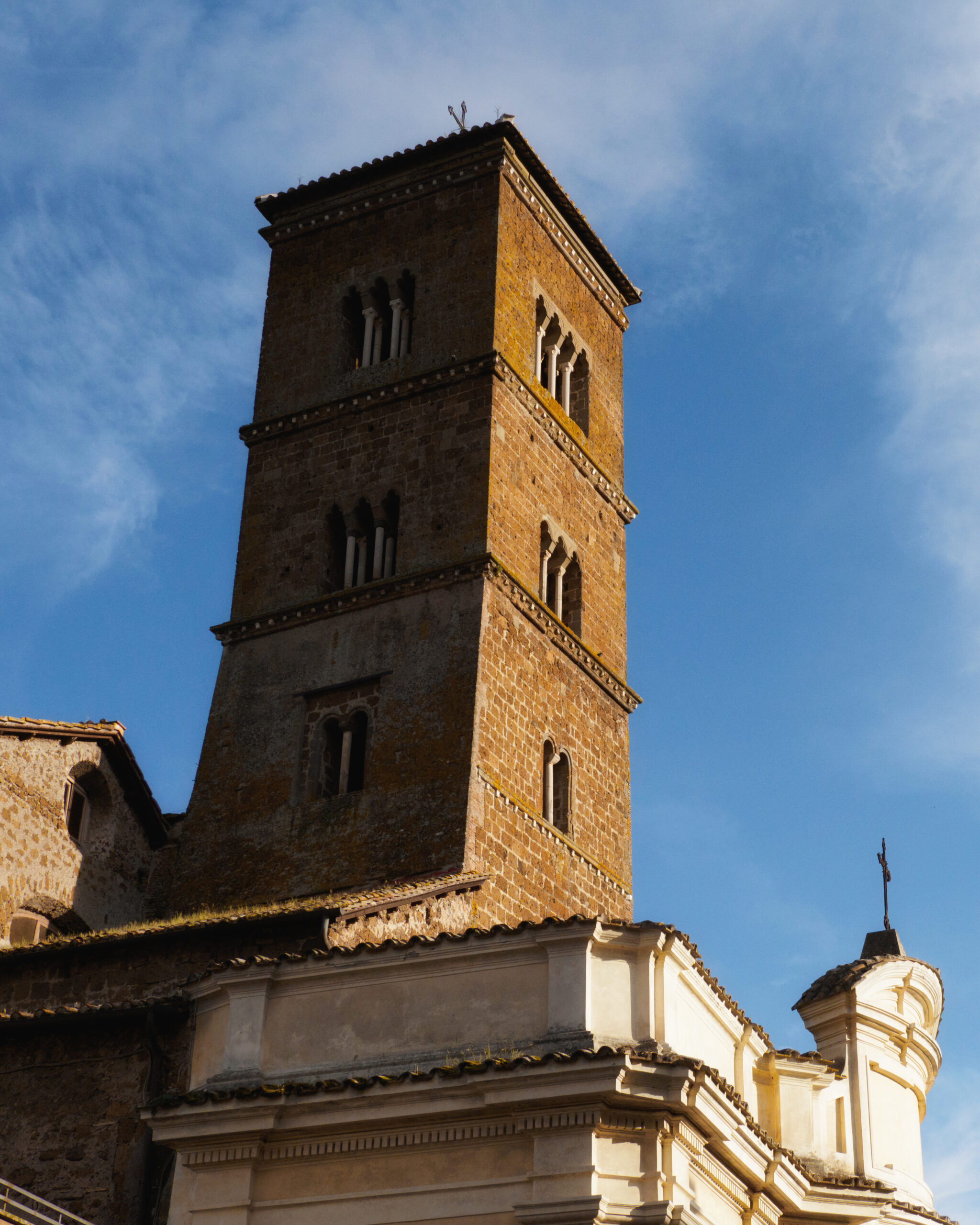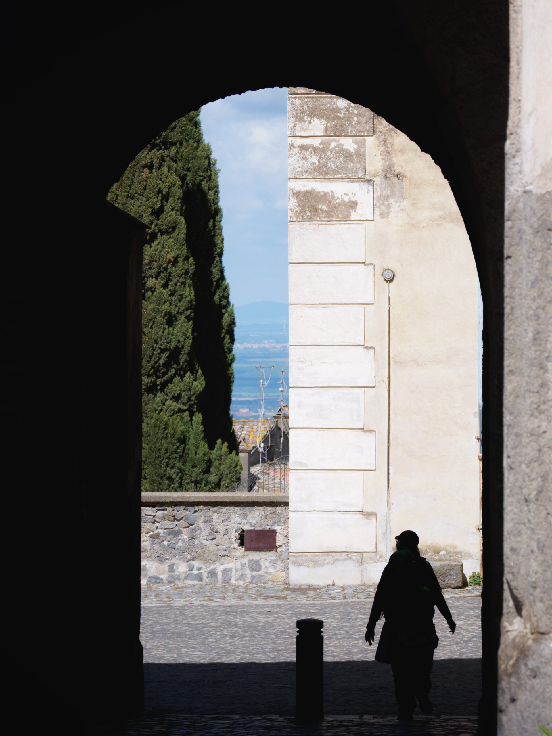 San Martino al Cimino vale da sola la deviazione: un piccolo borgo a 560 metri sul livello del mare, con un’abbazia cistercense del XIII secolo sproporzionatamente grande rispetto alle dimensioni del paese — affascinante proprio per questo contrasto. Dal belvedere si apre un panorama sulla pianura che in mattinata è avvolto dalla foschia. Dopo il paese il sentiero ridiscende dolcemente attraverso un bosco fino al paesino di Tre Croci. Da qui si può scegliere: svoltare a destra seguendo la Francigena classica, oppure proseguire dritto sulla strada Forocassio, asfaltata e poco trafficata, che permette di risparmiare circa 2 km. Vetralla è l’arrivo più “rustico” di questo itinerario: il centro storico ha un’aria dimessa, con case fatiscenti che però hanno un loro fascino decadente.