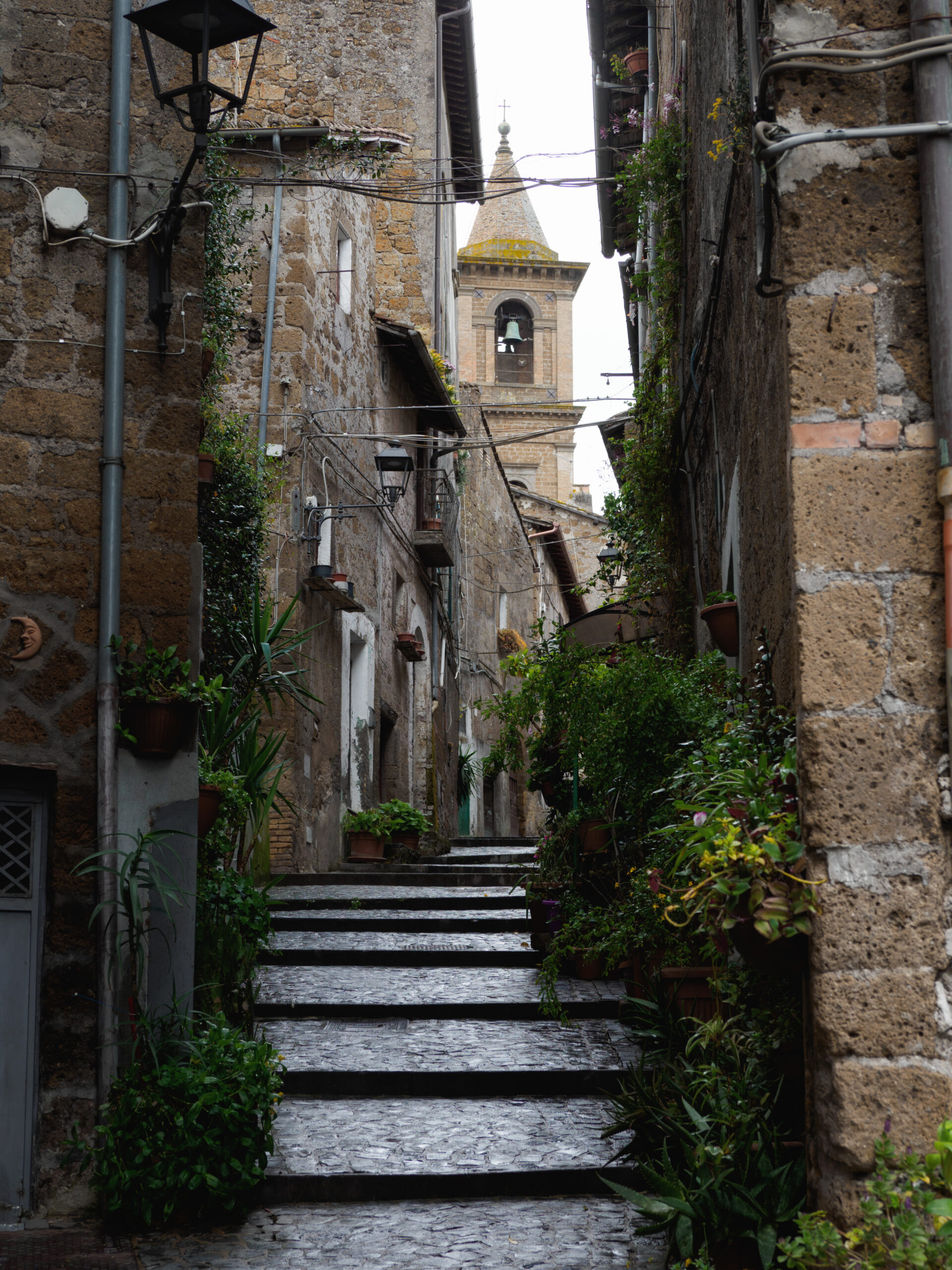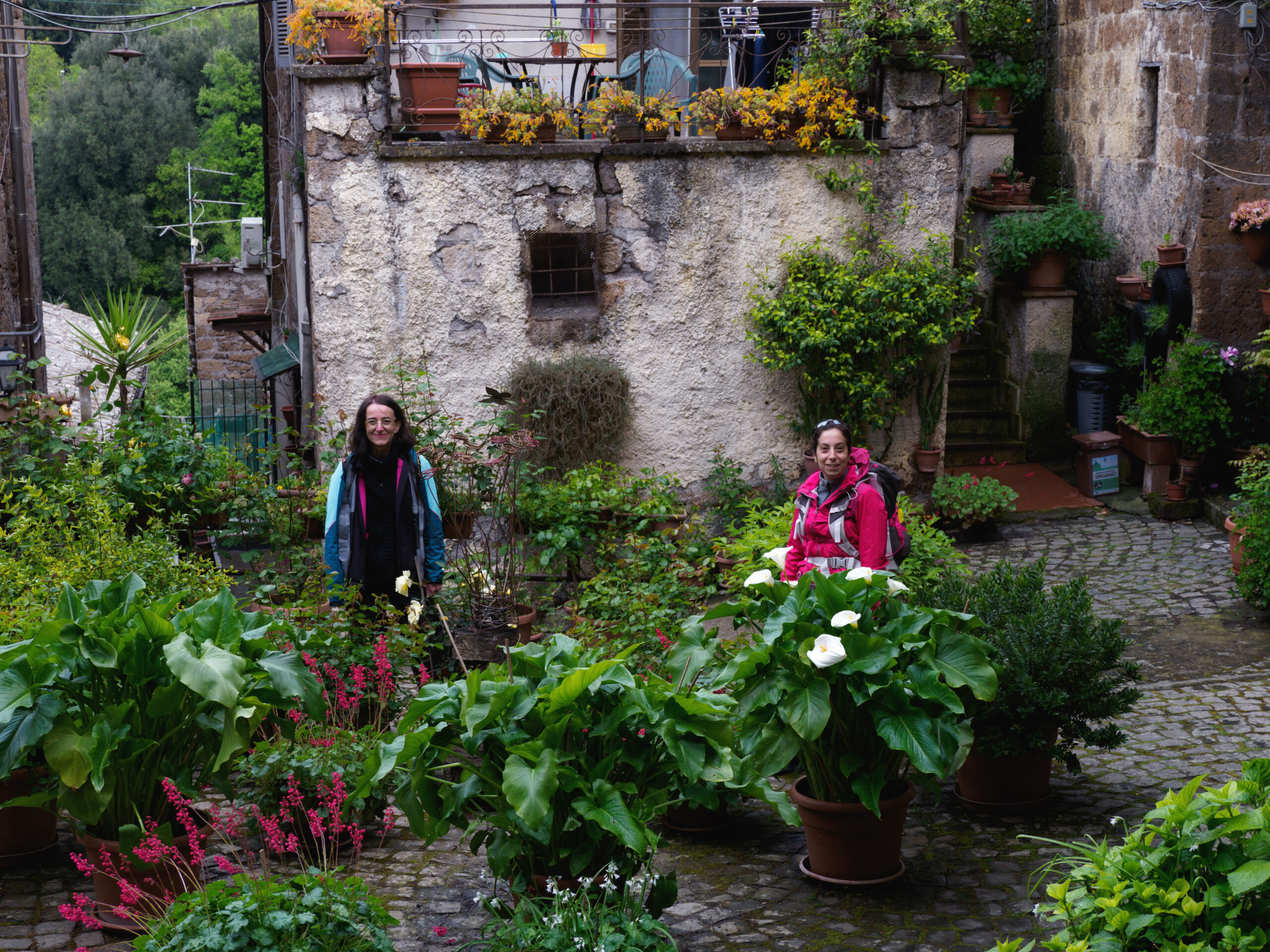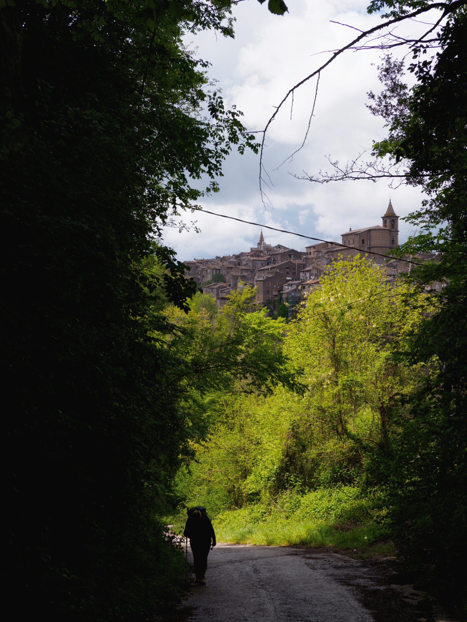 Prima di arrivare a Sutri, la Francigena attraversa Capranica: una tappa di passaggio spesso ignorata dalle guide, ma che merita una sosta. Il centro storico è arroccato su una collinetta con vicoli curati e una quiete rara. Qui abbiamo incontrato una signora portoghese da anni trapiantata in paese, che ci ha mostrato il suo giardino ricavato in uno spazio comune tra i palazzi — uno di quegli incontri impossibili fuori dal contesto del cammino. Uscendo dal paese si gode la vista di Capranica dall’alto, poi il sentiero costeggia un torrente attraverso ponticelli di legno: dopo le piogge il fondo è fangato e scivoloso, consigliamo bastoncini.