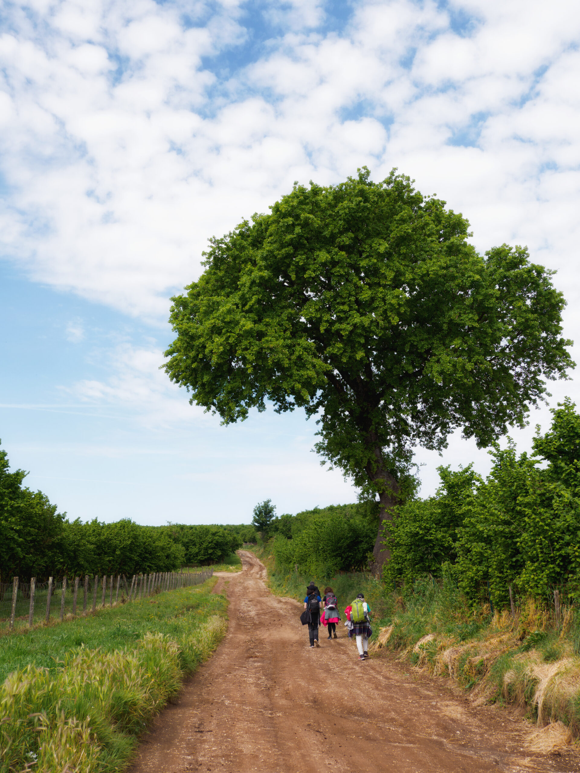 La tappa più lunga è anche quella che regala le sorprese più grandi. Lasciato il dislivello alle spalle, il percorso si distende in pianura tra immense piantagioni di nocciole: chilometri e chilometri di noccioleti ordinati che in certi punti ricordano le Langhe piemontesi. Un contesto fotogenico e inaspettato, perfetto per chi vuole immagini originali lontane dai cliché del pellegrinaggio.